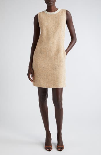 Contrast satin back-crepe trim brings a sporty edge to this vintage-inspired sleeveless dress crafted of richly textured Italian tweed.