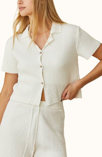 This effortlessly stylish top is knitted from breathable 100% cotton in a chic waffle texture, featuring a notched lapel collar and eco-friendly coconut buttons. The ribbed-knit trim adds a refined touch, making it the perfect match for relaxed, warm-weather days