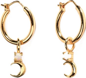 Channel the celestial powers with opal stones, featuring a pair of crescent moon charms on simple hoops. These earrings are hypoallergenic, nickel and lead free, and tarnish resistant.