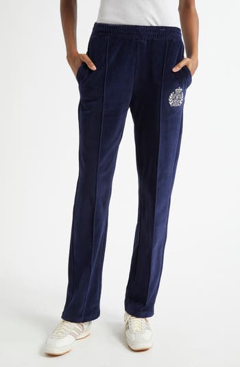 Regal crest embroidery punctuates the side of these delightfully soft velour track pants that have a stretchy elastic waist for added comfort.
