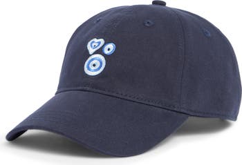 Evil eye-inspired embroidery evokes a warm Mediterranean vibe on this cute hat made from cotton canvas and finished with an adjustable back for a perfect fit.