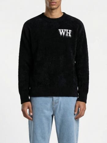 A plush brushed knit crew neck sweater offering a relaxed silhouette and subtle logo accent, ideal for weekend escapes and seamless layering.