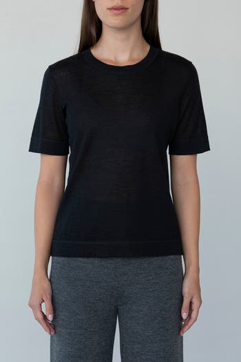 Our best-selling Crew-Neck Sweater Tee has a classic relaxed shape, with body length hitting at the high hip. It is knitted in semi-sheer luxury alpaca silk with self-yarn cover stitch details—the most elevated luxury tee you'll own.