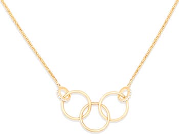 The Crew Triple Circle Necklace is a true staple piece in your collection. Featuring three interlocking 14k gold rings anchored on each side by a pave-set diamond jump ring and hanging from a diamond-cut wheat chain. This necklace is a timeless addition to your jewelry collection.