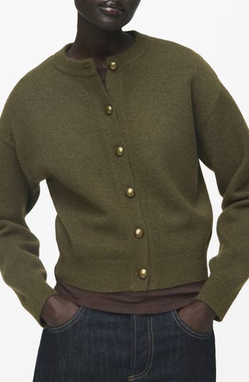 Create classic layered looks in this crewneck cardigan knit with a hint of wool and dotted with oversized buttons front and center.