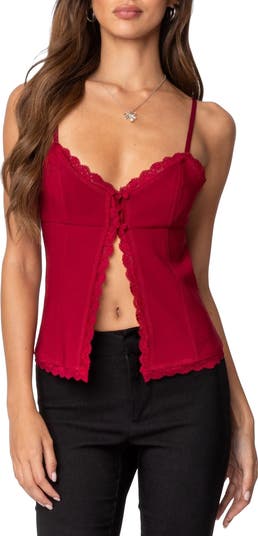 Lacy trim and a front slit heighten the modern romance of this scene-stealing camisole.