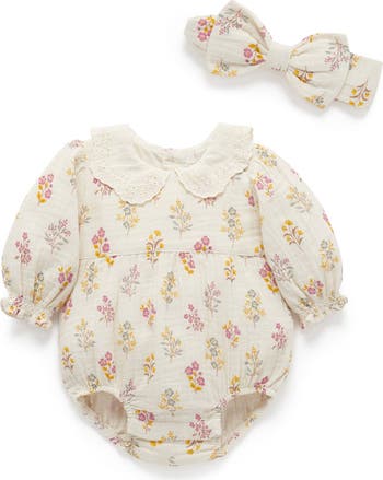 Our Crinkle Cotton Bodysuit Set is a sweet all-in-one style for those special occasions with your little one. Featuring a pretty lace collar, designed in a balloon style with gathers at the chest for a comfy fit. Made from the softest 100% Crinkle Cotton with a pretty all over floral print. Matching adjustable bow headband included.