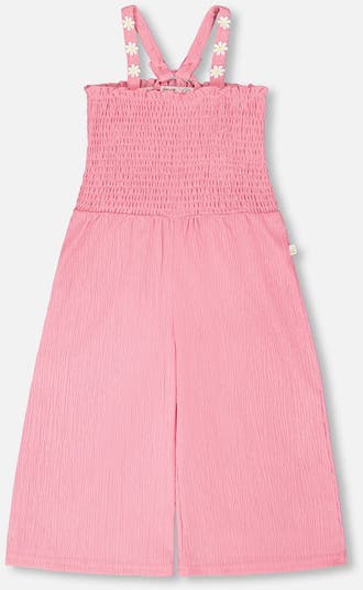 Chic and playful, our crinkle jersey jumpsuit with smocking in pink is designed for carefree summer days. This one-piece features a smocked bodice, crisscross straps with cute daisies, and wide legs for an easy fit in lightweight crinkle jersey fabric. Part of the “Explosion of Daisies” collection, it’s perfect for sunny adventures.