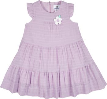 Light and lovely for warm-weather days, this dress is crafted from airy lavender crinkle lawn with a soft drape and gentle stretch. A sweet appliqué flower decorates the front yoke, while ruffled armholes add a playful, breezy touch. Designed with a back neck crossover opening for easy dressing, the tiered shirred skirt creates soft movement and an effortless silhouette. Falling above the knee, it’s perfect for vacations, sunny outings, and relaxed spring celebrations.