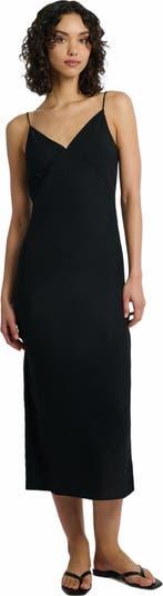 - Cut on the bias, this crinkled slip dress has a v-neck suspended from slim straps and a slightly fitted column skirt that falls to a floor-length hem.