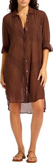 Lightly crinkled cotton keeps you cool but covered as you take a break from the waves in this button-up cover-up shirt with a curved high-low hem.