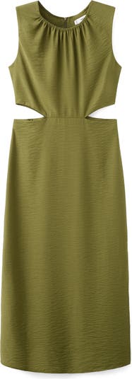 Waist-skimming cutouts lend alluring detail to a midi dress cut from silky fabric that's covered in a crinkled texture.