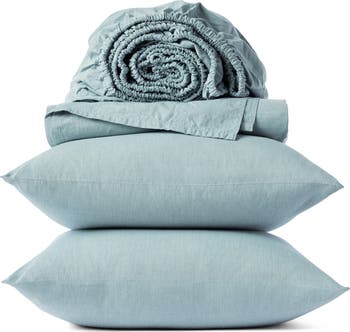 A sheet set woven of organic cotton is intended to look crinkled for a relaxed look while getting softer and more inviting with every wash.