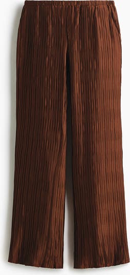 Trousers in a crinkled weave with covered elastication at the waist, side pockets and wide legs with an overlocked edge at the hems.