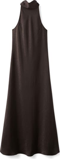 Made of softly crinkled satin, this midi dress features a mock neck with flowy ties trailing down the back.