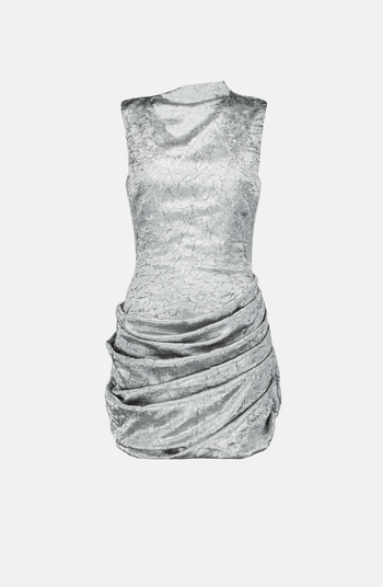 Silver metallic fitted mini dress with a tulip-shaped draped bottom and high asymmetrical neck. Features an invisible zipper at the center back.