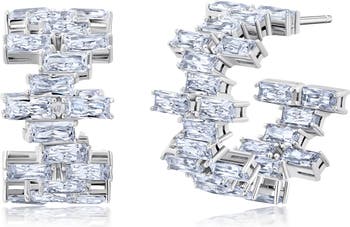 These polished huggie hoop earrings glow with hand-set cubic zirconia that stagger artistically around the curves.