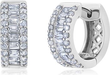 A row of baguette cubic zirconia is flanked by two rows of sparkling pave on these stunning huggie hoop earrings plated in platinum or 18-karat gold.