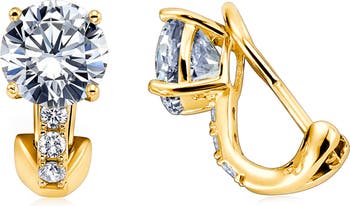 Birlliant-cut cubic zirconia are hand-set in these sterling silver clip-on earrings plated in 18-karat gold.