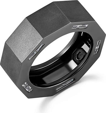 Hand-set baguette stones accent the industrial geometry of this polished bolt ring finished in sleek black rhodium.