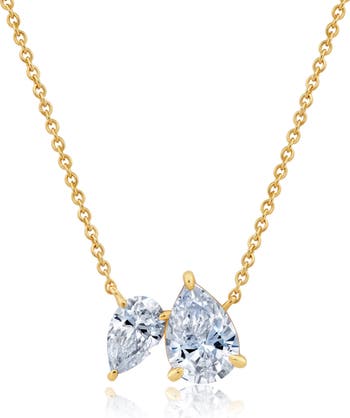 Hand-set cubic zirconia in pear-shaped cuts create a sparkling pendant on this gleaming chain necklace plated in platinum or 18-karat gold.