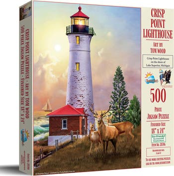 Escape to the serene shores of Lake Superior with the Crisp Point Lighthouse 500 piece jigsaw puzzle by SunsOut. Capture the tranquil beauty of nature and the majestic presence of the lighthouse through the licensed artwork of renowned artist Tom Wood. The precision interlocking pieces, made from high-quality recycled cardboard, allow for durable and effortless assembly, creating a satisfying puzzle experience that keeps both seasoned and beginner puzzlers engaged. When completed, the finished size of 18" x 24" transforms this puzzle into a piece of art that depicts the harmonious coexistence of humanity and nature, perfect for decorating your living space. Proudly made in the USA and committed to quality and customer satisfaction, SunsOut puzzles reflect superior manufacturing standards, offer a worry-free guarantee and are produced by a woman-owned business. Demonstrating environmental responsibility, SunsOut utilizes eco-friendly soy-based inks and recycled materials, creating puzzles that respect both the planet and the dedicated puzzle enthusiast. Choose a puzzle that aligns with your values and enjoy the unique challenge presented by the random-shaped pieces. With SunsOut, experience tranquility by the sea and an eco-conscious yet vibrant puzzle experience.