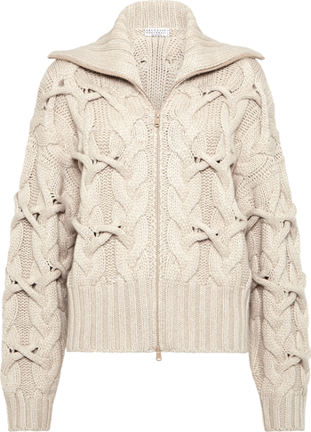 - Two-way zip closureHigh collarDrop shoulderWide sleeveCable knit