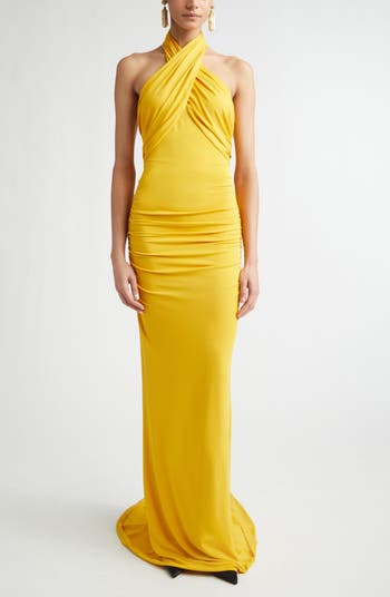 Drapey jersey is dyed in a vibrant saffron hue on this crisscross halter-neck gown that hugs the body before extending into a pooling puddle train.