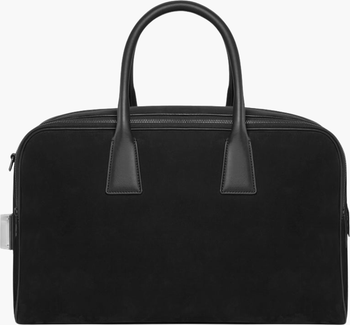 Versatile weekend bag in nubuck lined in Alcantara. Features double zipped compartments, interior and exterior pockets, trolley sleeve, shoulder strap, and Aviteur prism clasp.