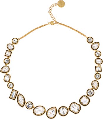 Let your modern elegance shine when you wear this sparkling necklace designed with mixed-cut crystals in bezel settings so it lays gently againt your neckline like tumbled stones.