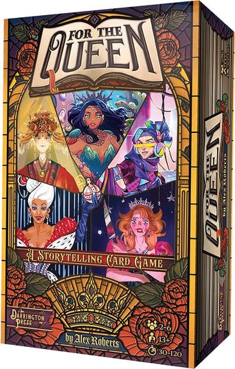 FOR THE QUEEN - A collaborative storytelling card game story of love, betrayal, doubt, and devotion by Alex Roberts. Hear ye, hear ye! A game that invites you and up to five other players to tell a dramatic narrative about a Queen’s journey with you, her companions that can begin playing in minutes. CHOOSE YOUR QUEEN from among a diverse selection of gorgeously varied illustrations - or create your own - and use the prompt cards to collaboratively tell a story of love, betrayal, doubt, and devotion. What will you learn about her (and yourself) along the way? In the end, will you stand for or against her? The 91 cards come in a travel-ready box with a ribbon perfectly placed for easy card removal, making this game ideal for on-the-go gameplay at a convention, around a campfire, or waiting in line at the DMV! With 25 unique illustrated Queens to inspire you, and taking place in any genre or setting you choose, you’ll never tell the same tale twice. KEY DETAILS: Players: 2–6+. Play time: 30-120 minutes. Age: 13+.