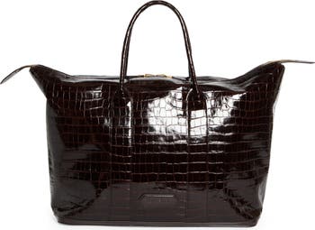 Sized to hold essentials for an overnight or weekend getaway, this roomy bag crafted of croc-embossed calfskin leather is branded with a signature logo patch.