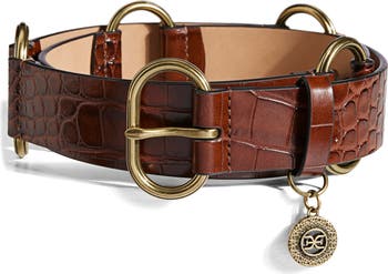 A croc-embossed strap makes its way through brushed hardware links that give this belt its distinctive look and feel.