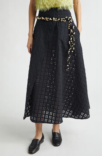 A layered front panel provides a wrap effect to this sheer-check-jacquard skirt featured in the lookbook for the label's spring '26 collection, 'Indecisions.' Handmade crochet trim highlights the waist and drapes down the side, bringing designer Kasuni Rathnasuriya's 'slow fashion' ethos to the style.