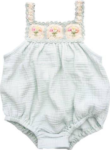 The Crochet Bubble—a true heirloom for the littlest loves. Hand-crocheted chest panel adorned with three delicate bouquets, each one hand-embroidered by Peruvian artisans. Every piece takes days to complete, making each bubble truly one-of-a-kind. Crafted in a dreamy pastel color with soft, breathable cotton gauze—gentle on delicate skin and perfect for crawling, playing, and discovering the world. Made slowly in Peru with intention and care.