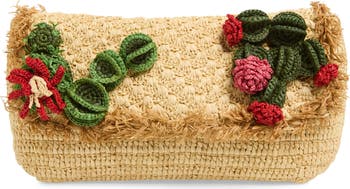 Add color and personality to your warm-weather outfits with this crocheted-raffia clutch purse edged with fringe and embellished with hand-crocheted cacti blooms on the flap.