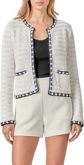 This delicate cardigan is a warm-weather delight in breezy open-work crochet.