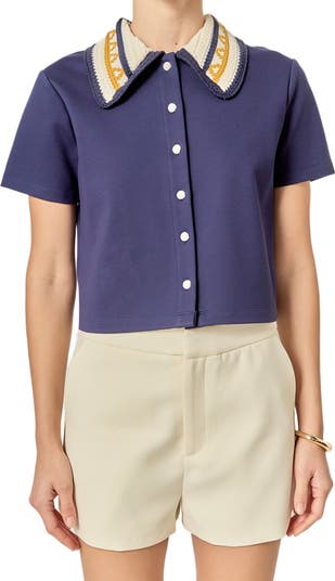 A colorful crocheted collar steals the spotlight on this cropped knit button-up top, bringing a playful, homespun feel to the look. Finished with short sleeves and sculptural rose-shaped buttons, it's an easygoing statement piece with plenty of personality.