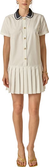 Sharp skirt pleats add swingy movement to this leggy-length shirtdress updated with an unexpected crochet collar.