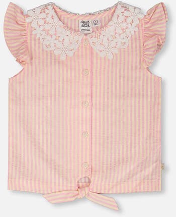 Fresh and stylish, our sleeveless shirt with pink and yellow stripes and a crochet collar is perfect for sunny days. This blouse features flutter details at the shoulders, a delicate crochet Peter Pan collar, a full front button placket, and a charming front tie knot for a playful twist. Part of the “Explosion of Daisies” collection, it pairs beautifully with skirts, shorts, or pants for an effortlessly chic summer look.