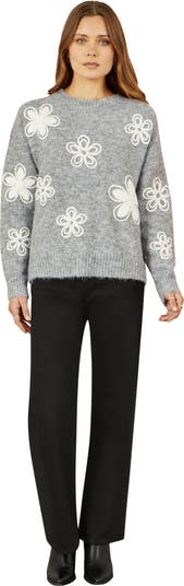 This lovely relaxed sweater boasts a gorgeous crochet flower design. The super soft knit is great for wearing everyday with denim or wide leg trousers for work or weekend.