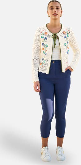 This cardigan features a beautifully detailed open-knit design with vibrant, embroidered floral motifs running down each side of the front. Its soft base is complemented by pretty trim along the neckline, front edges, and tie closure, adding a fresh, garden-inspired touch. The scalloped hem and cuffs enhance its delicate, handcrafted feel, making it a charming layer that blends elegance with a playful burst of colour.
