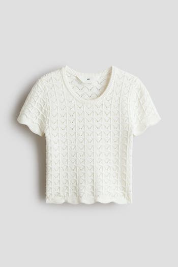 Top in a soft, crochet-look pointelle knit. Ribbed round neckline, short sleeves and scalloped-edge, ribbed trim at cuffs and hem.