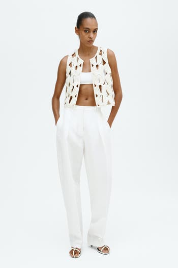 Short, sculptural knit vest in a crochet-look cotton blend. Round neckline and open front. Unlined.