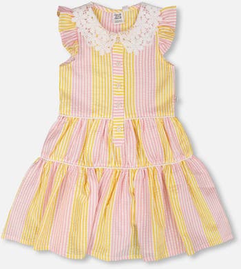 Charming and bright, our sleeveless dress with Peter Pan crochet collar in pink and yellow stripes is a summer essential. This casual dress features flutter sleeves, a scalloped crochet Peter Pan collar, a button-front opening, and a gathered tiered skirt for playful volume. Perfect for sunny days, it pairs beautifully with other pieces from the “Explosion Of Daisies” collection.