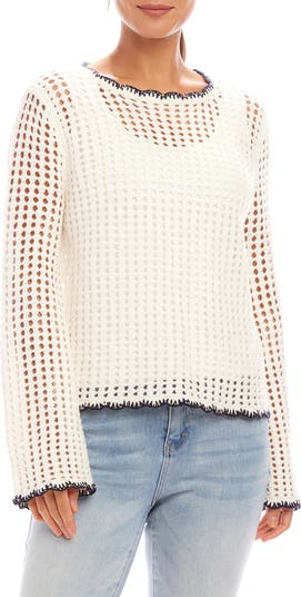 Airy crochet stitching brings layer-worthy charm to this day-to-night sweater knit from a soft cotton blend.