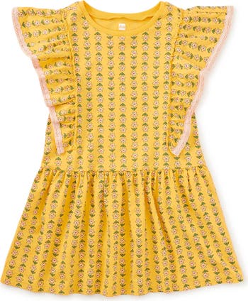 Sweet details meet everyday ease in this cheerful dress. Crafted from soft, breathable cotton jersey, it features a classic crew neckline, a relaxed drop waist, and fluttery ruffle sleeves finished with delicate crochet trim for a vintage-inspired touch. The gathered skirt adds gentle movement while keeping things comfortable and easy to wear all day. It pairs perfectly with leggings or Somersault Shorts for monkey-bar-friendly versatility and carefree days on the go.