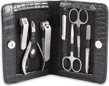 Everything you need to keep your nails neatly trimmed tucks inside this leather case with a sophisticated crocodile texture.