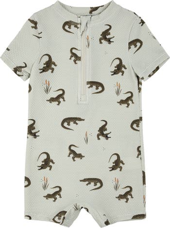 This textured one-piece swimsuit is framed by short sleeves and made with a convenient half-zip placket that makes changing baby a breeze.