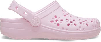 Floral laser-cut details enhance the breathability of this classic, kid-size clog crafted from durable Croslite® and set on a nonmarking, skid-resistant sole for superior traction.